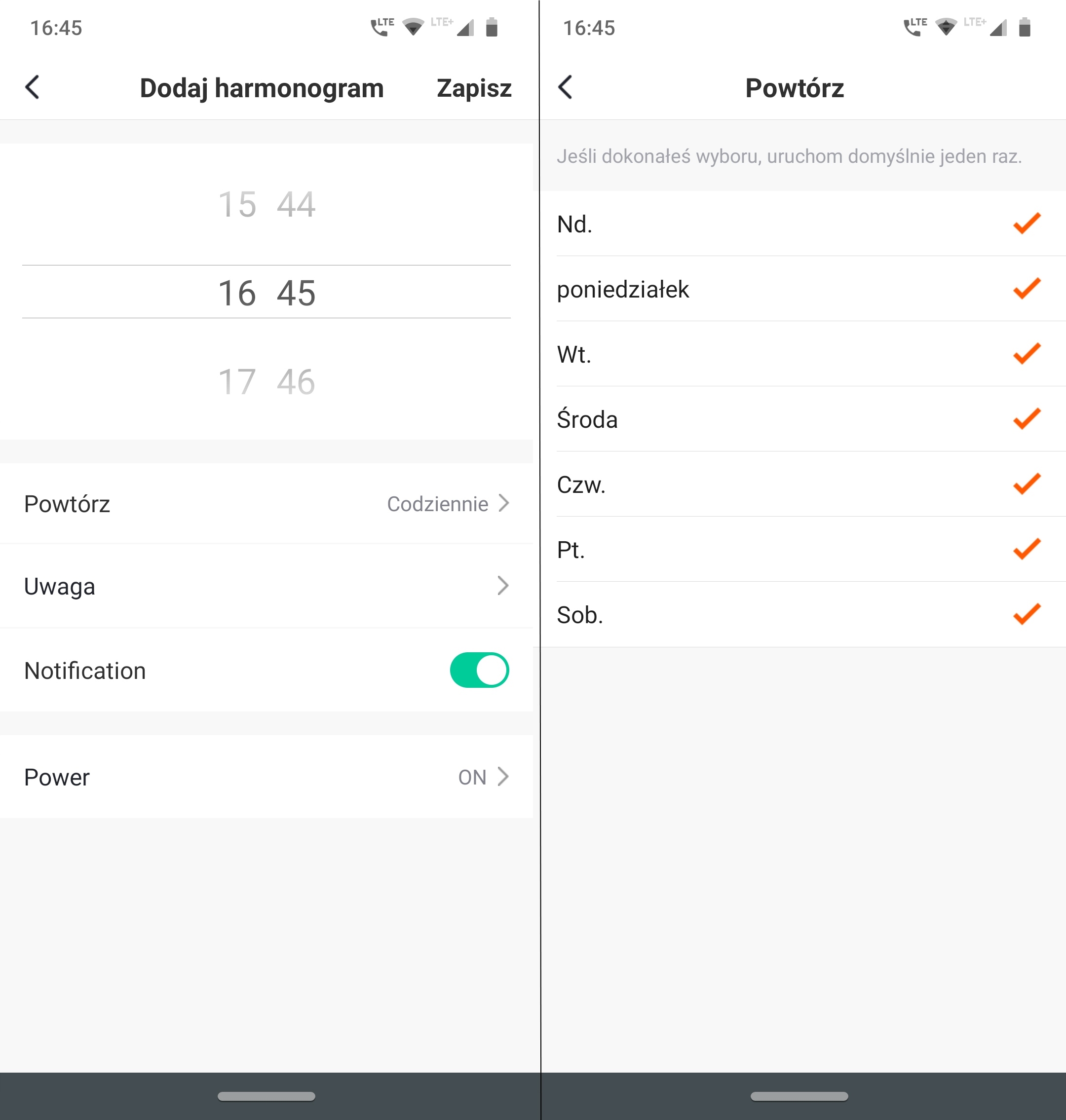 W aplikacji można zrealizować ustawienie włączania lub wyłączania w ramach harmonogramu.