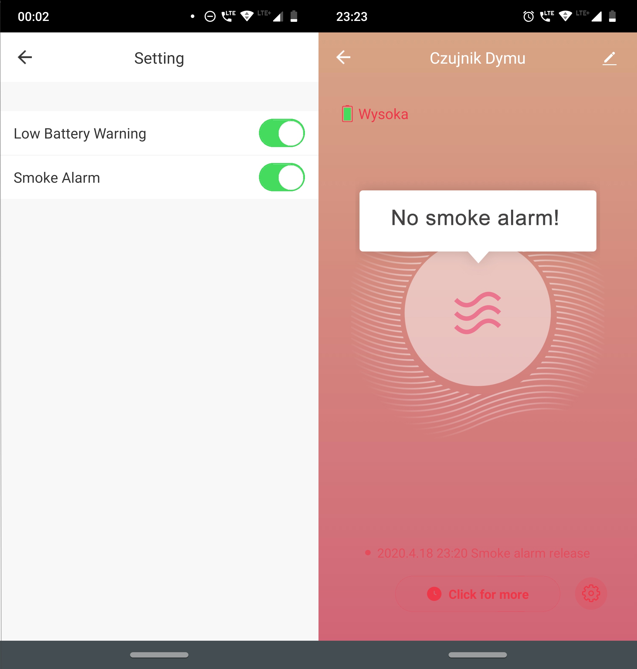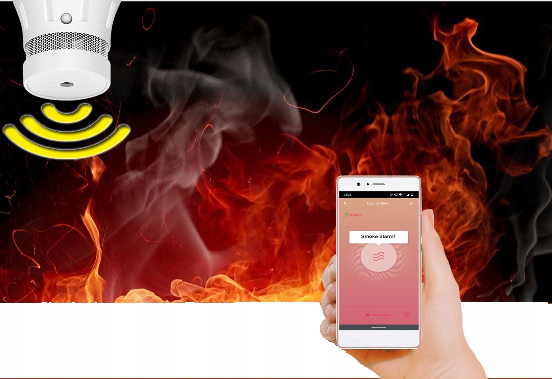Po wykryciu dymu urządzenie rozpoczyna sygnalizację z jednoczesnym powiadomieniem na telefon aby chronić Twoich bliskich i Twoją własność.