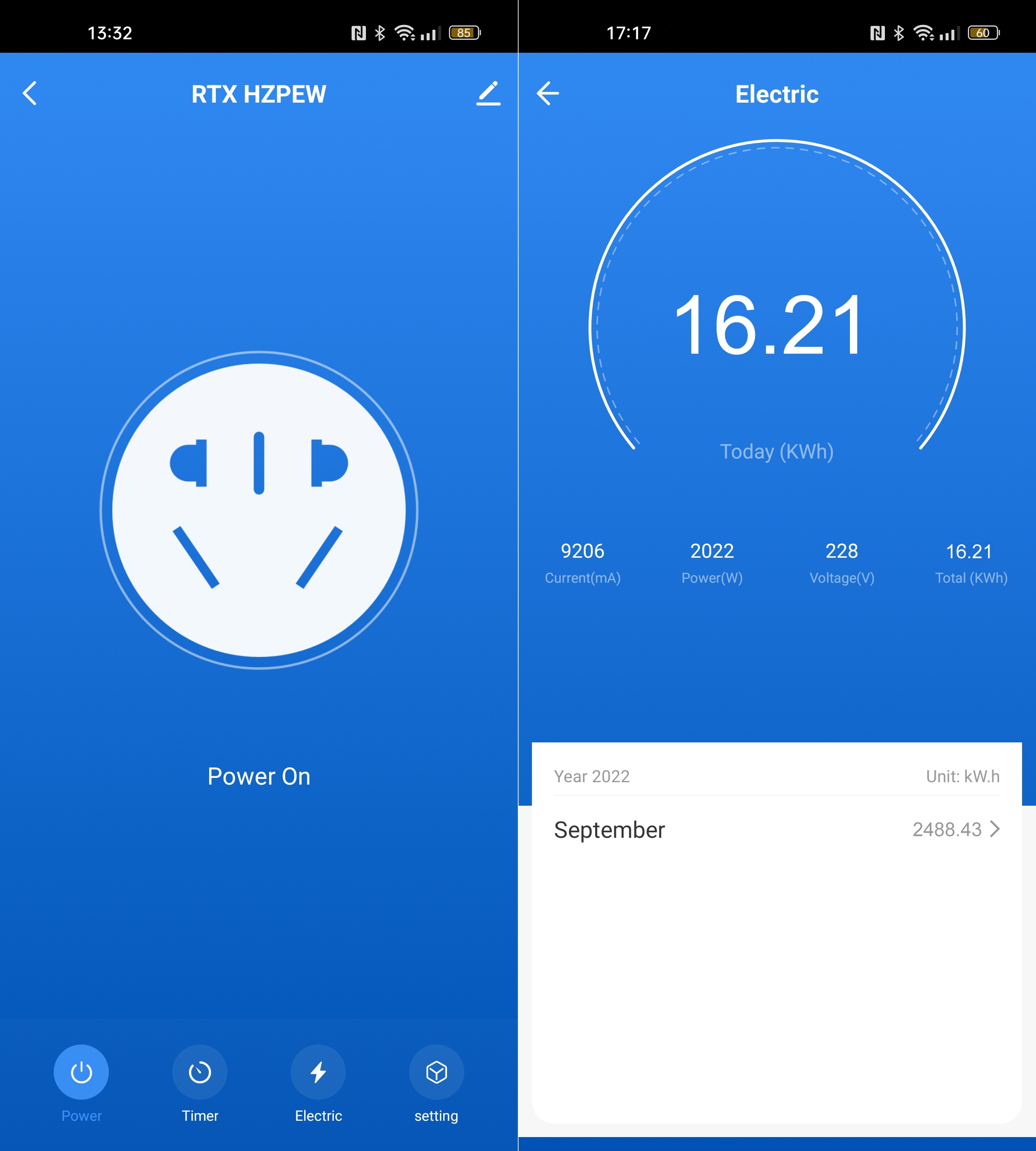 W aplikacji użytkownik może sprawdzić bieżący pobór prądu(A), moc (W), napięcie(V) .