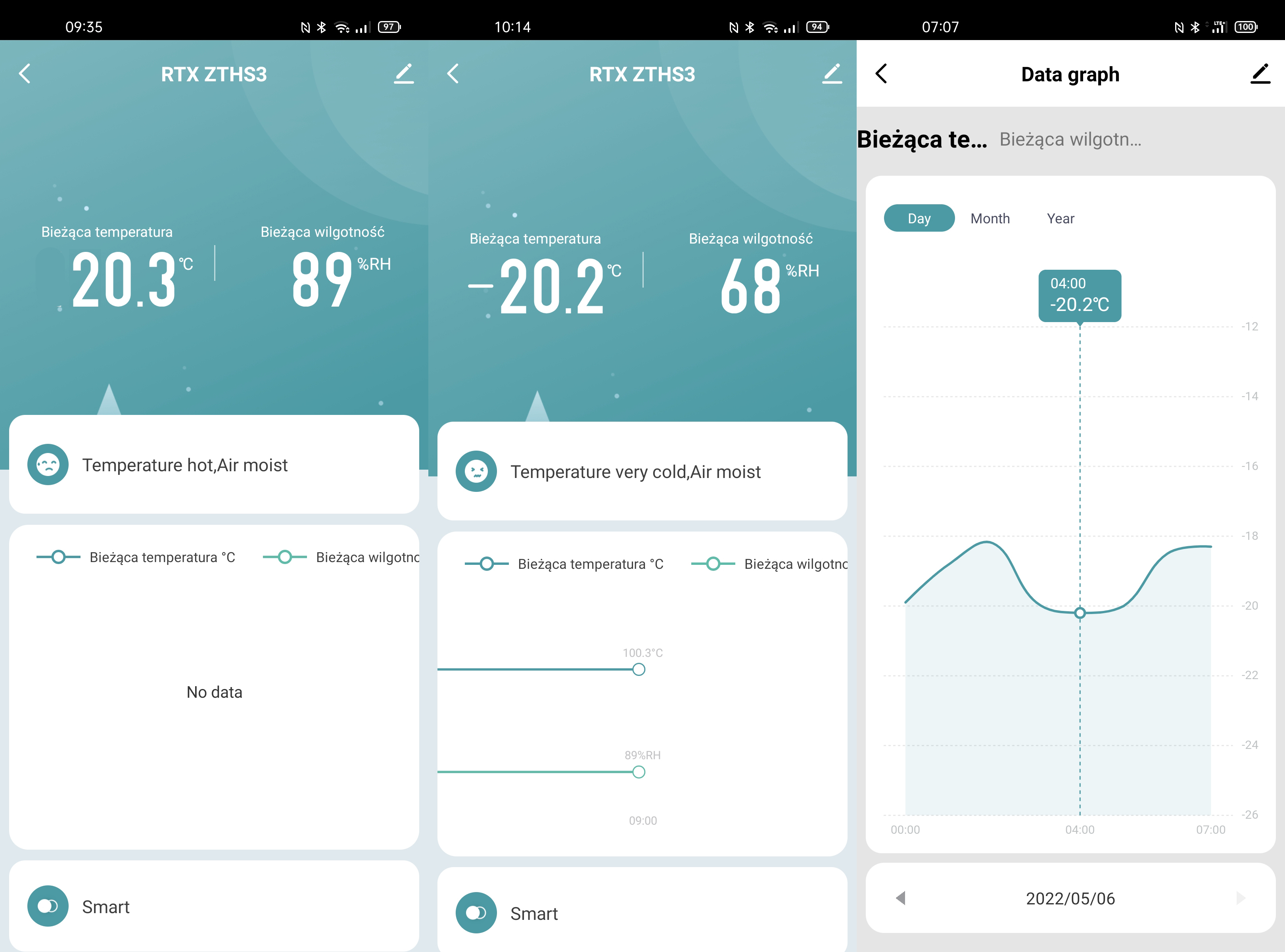 Dane na wyświetlaczu odświeżane są co 1minutę, a wymiana danych z aplikacją Tuya realizowana jest co 20minut. Z tego względu czujnik nie jest przeznaczony do kontroli i sterowania procesami gdzie zachodzą szybkie zmiany temperatury i wilgotności.